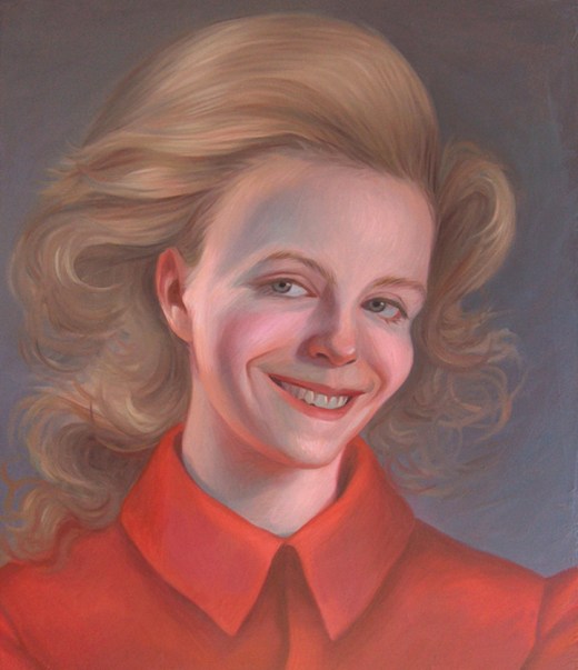 FLDS Woman in Red III, Oil on Panel, 18 1/4” by 18″